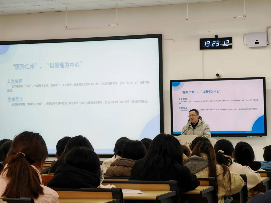 董强围绕“立志、勤学、慎思、笃行、强健体魄”五大维度进行讲解。他强调,医学的核心价值在于“人文关怀”与“生命至上”,口腔医学作为一门艺术与科学交融的学科,不仅要求精湛技术,更需要培养“以患者为中心”的人文情怀。他指出,医学本质是“人学”,要求医者敬畏生命、尊重尊严,实现身心并治的整体健康观。