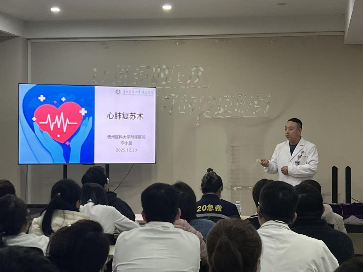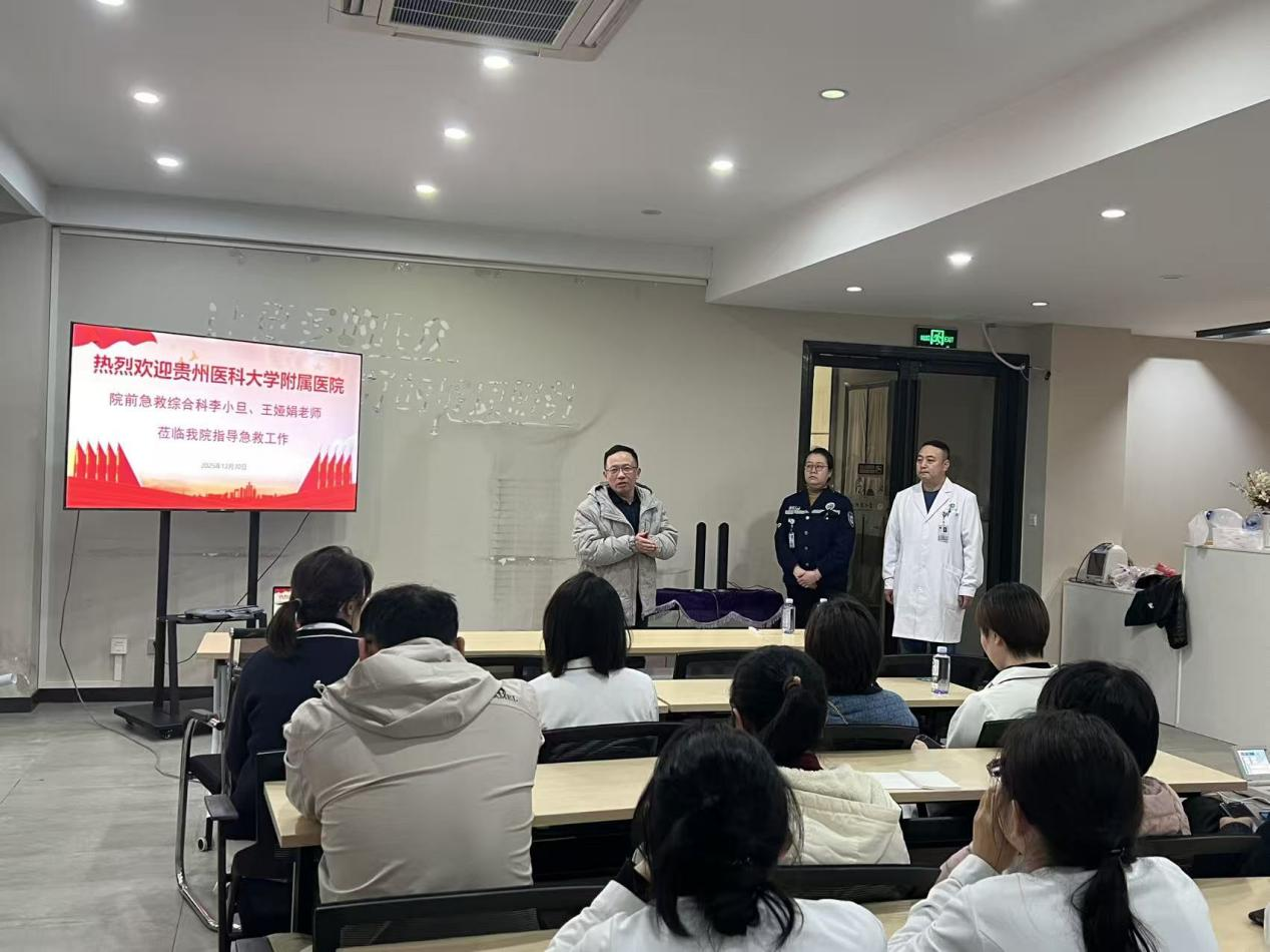 特邀贵州医科大学附属医院院前急救综合科李小旦、王娅娟两位专家来院开展急诊知识培训与实操演练。院党委委员、副院长董强出席活动,全院医护药技人员参加培训。培训由医务科副主任孙昆俊主持。