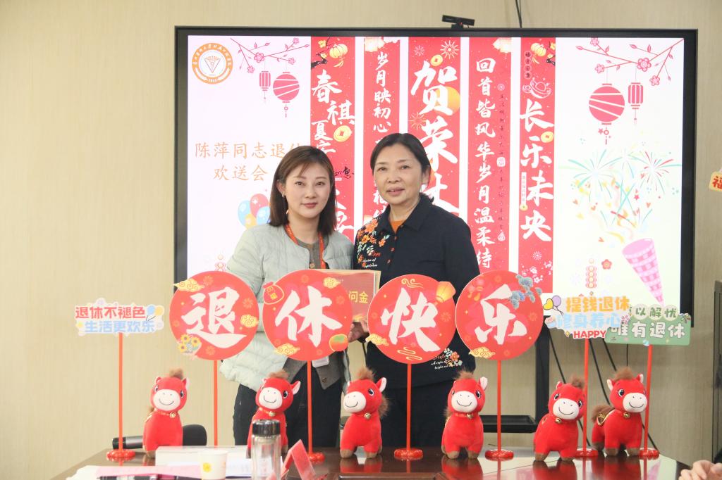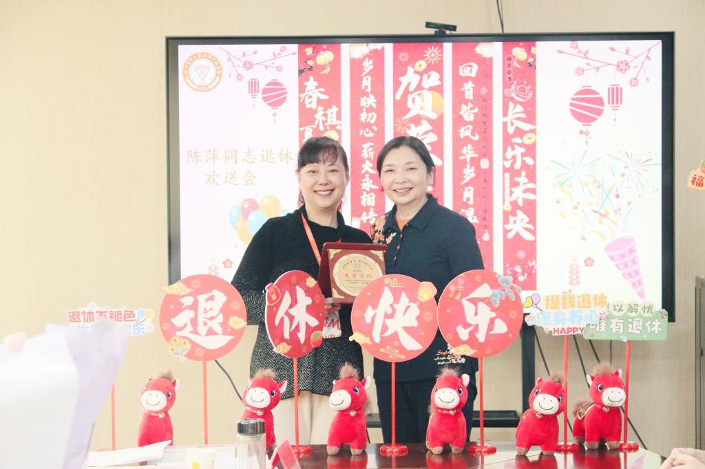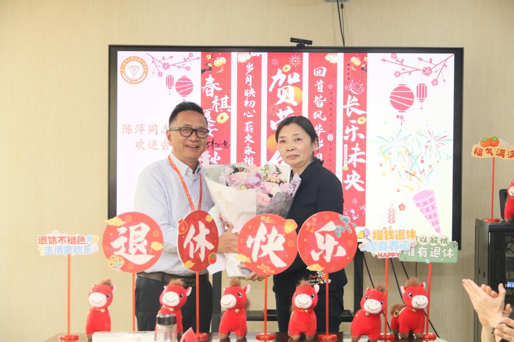 院党委副书记何雨羲代表组织向陈萍赠送退休慰问品,表达组织的关怀与感谢。