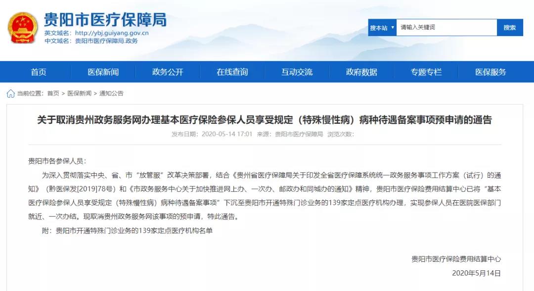 以前办理特殊门诊业务需要在网上预申请,现为方便群众,实现参保人员在医院医保部门就近、一次办结,贵阳市医保中心于5日15日下发相关通告,明确将“基本医疗保险参保人员享受规定(特殊慢性病)病种待遇备案事项”下沉至贵阳市开通特殊门诊业务的139家定点医疗机构办理,同时取消贵州政务服务网该事项的预申请。