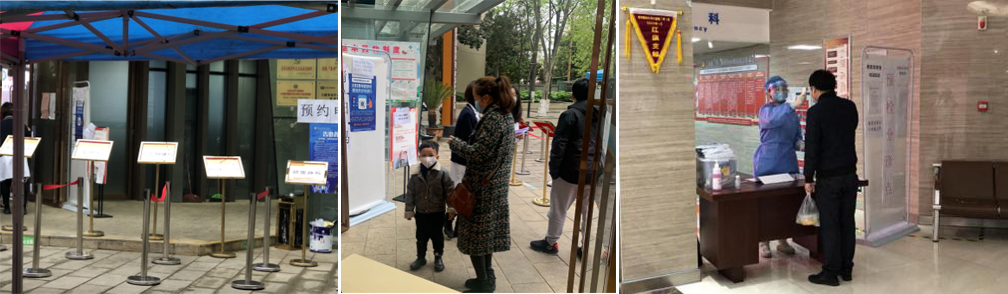 院党政领导高度重视人流分散、预检筛查和个人防护管理,疫期开诊以来,要求各部门严格执行实名制电话预约和分时段就诊政策,规划医院通道,设置提示标牌,完善消防安全管理,建立复诊患者便捷流程,并在医院增设候诊区,使来院人员能够保持1米以上安全距离。