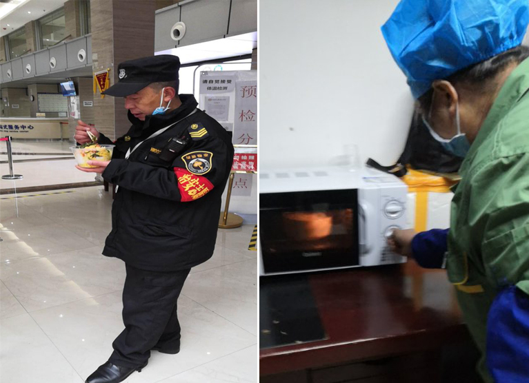 中午了,借用各楼层的微波炉把自带的午饭加热一下,吃完饭抓紧休息一下,午间的打扫和消毒又要开始了。